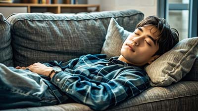 Tā tài lèi le, tǎng zài _____ shàng jiù shuìzháo le.
