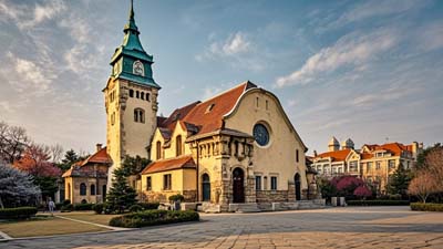 In Qingdao, there are tall edifices and large mansions including European-style buildings, e.g. the buildings at Badaguan (Eight Passes) and the churches on Jiangsu and Zhejiang Roads. In the city, the blue sky, green trees, red tiles and yellow walls form a beautiful setting. Here there are the blue sea, red reefs, golden sand and a very broad beach where many Qingdaonese enjoy swimming and taking walks.