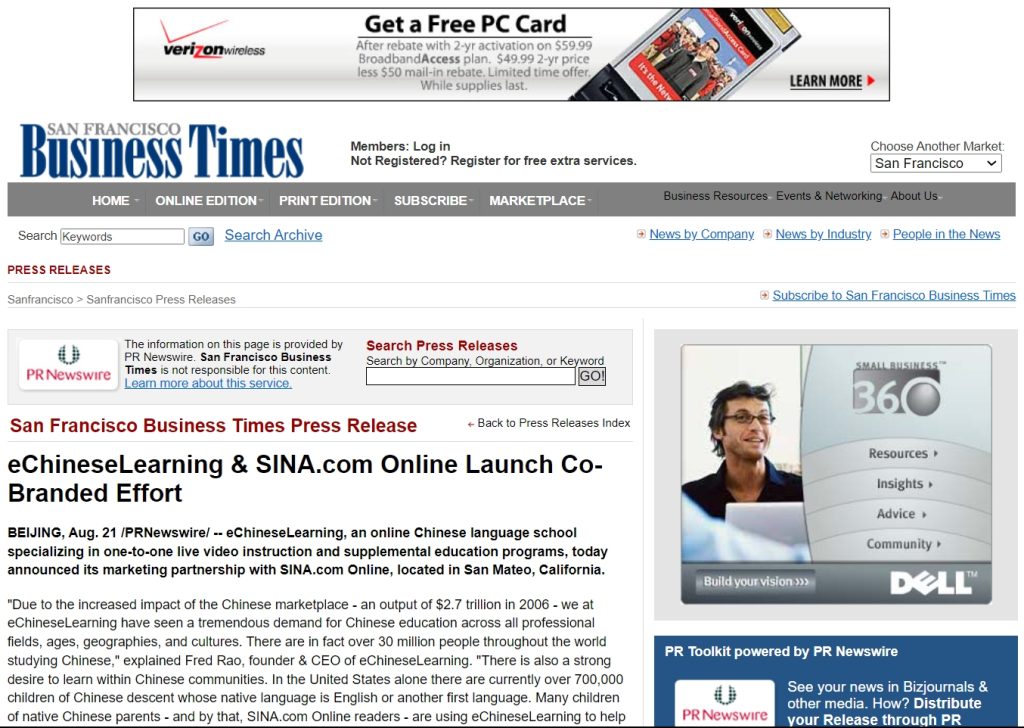 Angela Chen, SINA.com Online General Manager, commented: “Through this partnership, eChineseLearning gives over one million SINA.com Online readers ready access to superior Chinese language education, particularly for Chinese communities with family members in North America and overseas. We believe that by providing eChineseLearning to SINA overseas readers, their Chinese roots grow stronger, and they in turn will develop an even greater understanding of Chinese language and culture.”