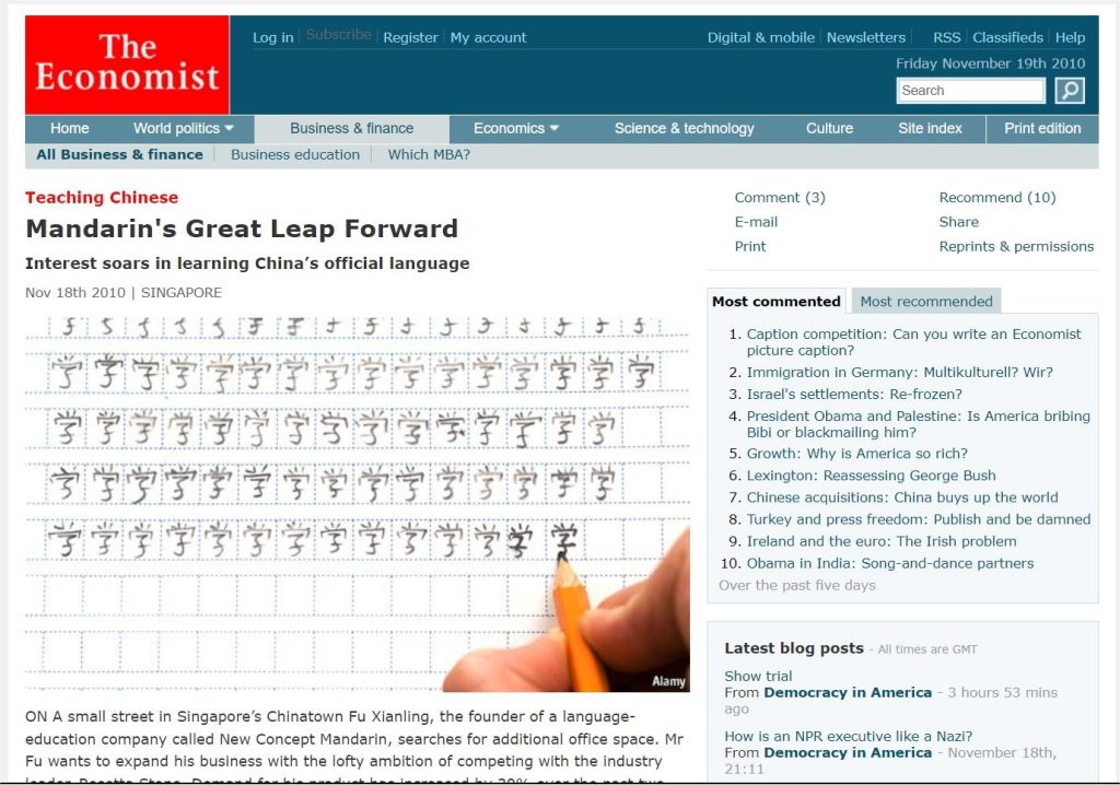 As the Chinese economy surges, so does interest in Mandarin. The Chinese government estimates some 40m people study Mandarin outside the country, up from 30m in 2005. A tight job market in the West is partly responsible. According to a survey in September by Rosetta Stone, 58% of Americans believe the lack of foreign-language skills among native workers will lead to foreigners taking high-paying jobs. “The recession has focused people on where growth is going to come from,” says Tom Adams, the firm’s chief executive. Among existing corporate customers logging into the company’s multi-language programme, the number learning Mandarin increased by 1,800% between 2008 and 2010.