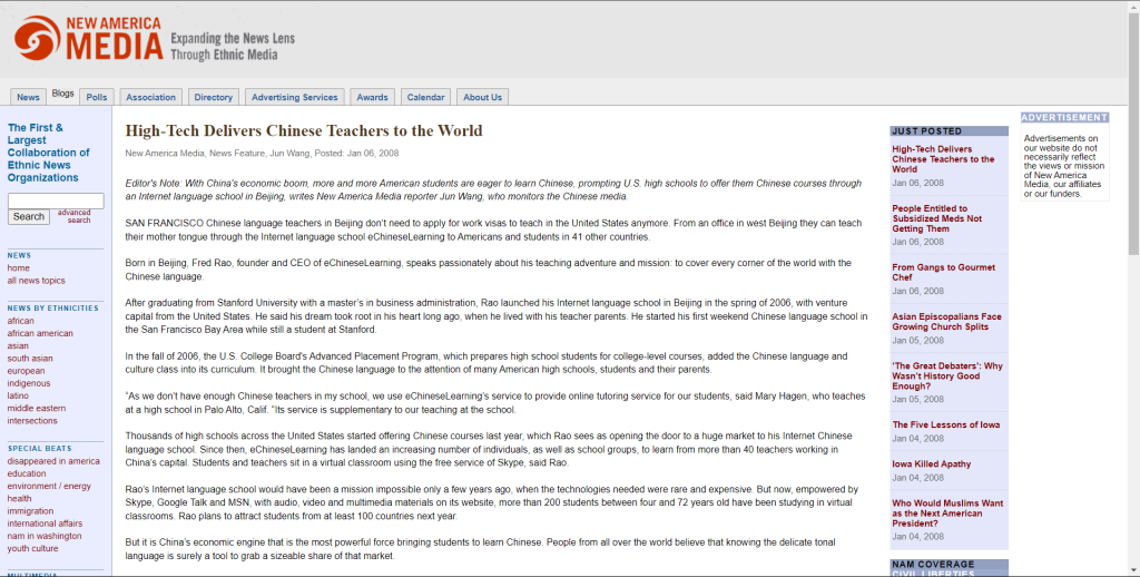“As we don’t have enough Chinese teachers in my school, we use eChineseLearning’s service to provide online tutoring service for our students, said Mary Hagen, who teaches at a high school in Palo Alto, Calif. “Its service is supplementary to our teaching at the school.