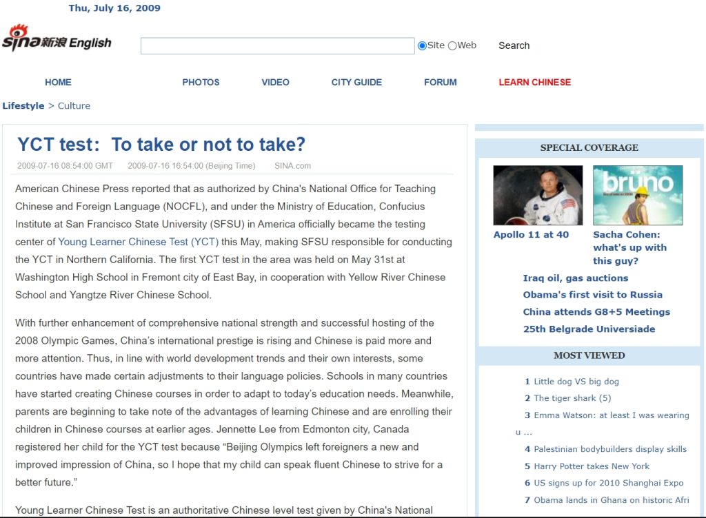 American Chinese Press reported that as authorized by China’s National Office for Teaching Chinese and Foreign Language (NOCFL), and under the Ministry of Education, Confucius Institute at San Francisco State University (SFSU) in America officially became the testing center of Young Learner Chinese Test (YCT) this May, making SFSU responsible for conducting the YCT in Northern California. The first YCT test in the area was held on May 31st at Washington High School in Fremont city of East Bay, in cooperation with Yellow River Chinese School and Yangtze River Chinese School.