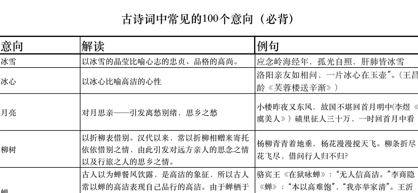 我根据历年古代诗歌鉴赏真题,整理了古诗词中常见的100个意象,包括意象,解读,对应的例句三个方面,方便同学们背诵复习。有需要的同学,请添加微信(sunflower11081)(sunflower11081)免费领取,无偿分享哦!